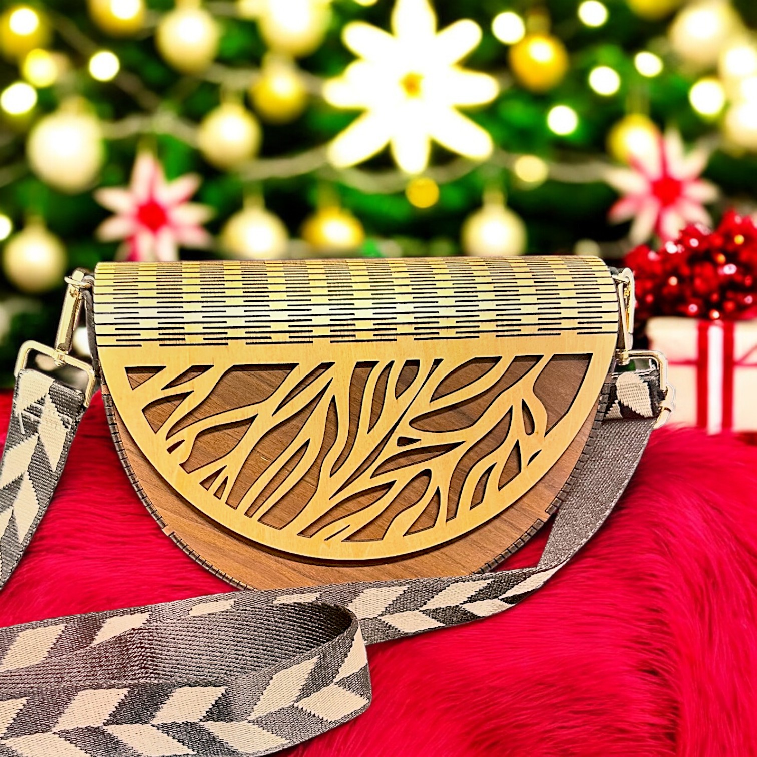 Each piece that makes up the purse is cut to size on a laser machine. Slats are cut into portions of the wood to create unique flexibility allowing the opening flap to bend as needed in a smooth fashion. Some include designs that have been laser engraved into the wood Once all pieces are done, it is then crafted and glued together for the final product.