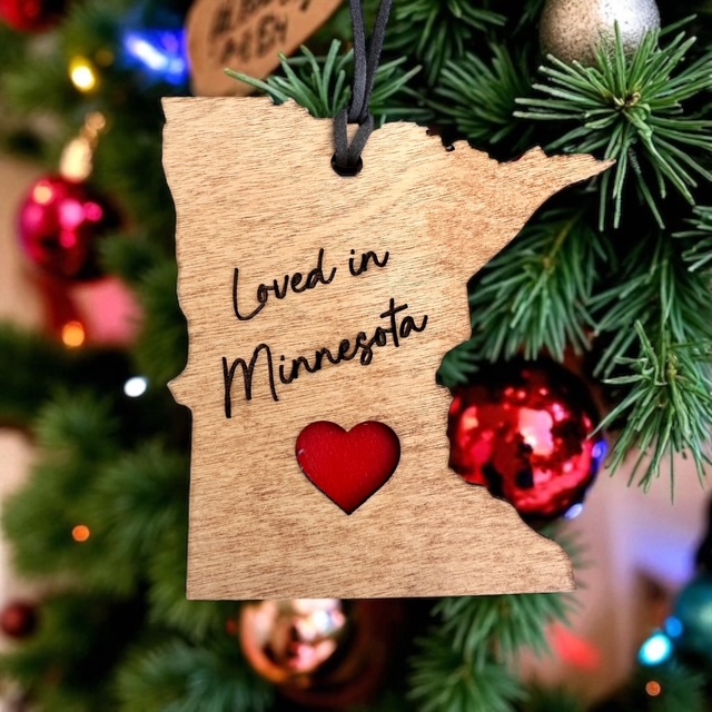 Each ornament is crafted from two layers of quality wood, precisely cut and engraved using a laser for intricate detail. The top layer is engraved with the words “Loved in Minnesota” and includes a heart-shaped cutout, while the bottom layer is finished in a rich red tone that shines warmly through the heart.