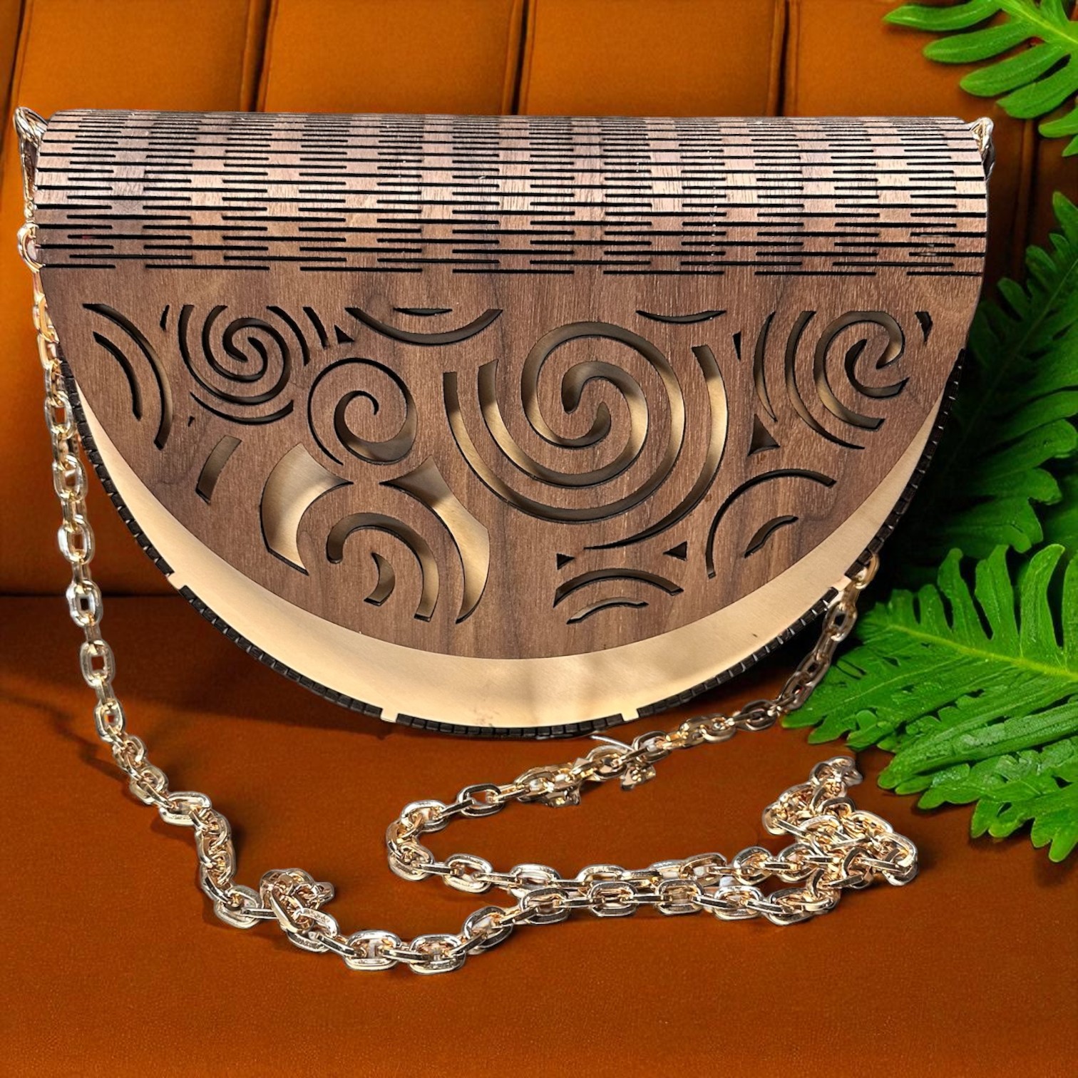 Each piece that makes up the purse is cut to size on a laser machine. Slats are cut into portions of the wood to create unique flexibility allowing the opening flap to bend as needed in a smooth fashion. Some include designs that have been laser engraved into the wood Once all pieces are done, it is then crafted and glued together for the final product.